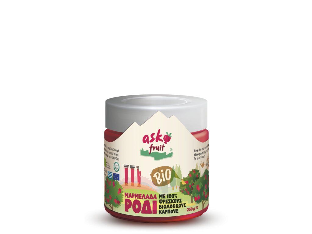 Tato bio marmeláda z granátového jablka je vyrobena z pečlivě vybraných plodů pocházejících z ekologického zemědělství v Řecku. Obsahuje čerstvá semínka granátového jablka, která marmeládě dodávají přirozenou strukturu a výraznou chuť. Marmeláda je vyráběna a balena v Řecku společností Asko Fruit. Výrobní proces klade důraz na šetrné zpracování ovoce, aby byla zachována jeho přirozená chuť a charakter. Produkt je certifikován jako BIO dle platné evropské legislativy.
