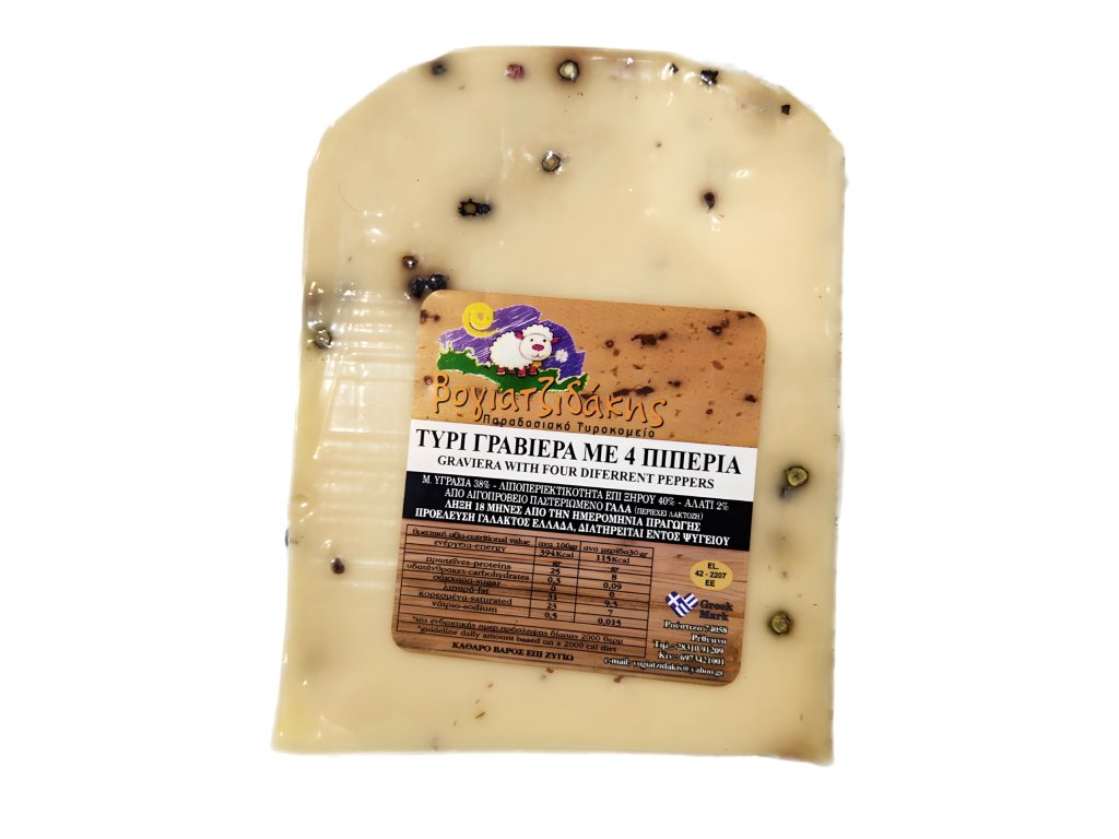 Graviera je tradiční řecký sýr z kozího a ovčího mléka, který milují všichni Kréťané a bez nej si svůj život neumí představit. Je bohatý na vápník pro zdravé kosti, obsahuje kvalitní bílkoviny pro růst a regeneraci tkání a je zdrojem důležitých minerálů jako hořčík, zinek a fosfor. Vyzkoušejte sýr ochucený čtyřmi druhy pepřů, který se výborně hodí k čerstvému chlebu a olivám.