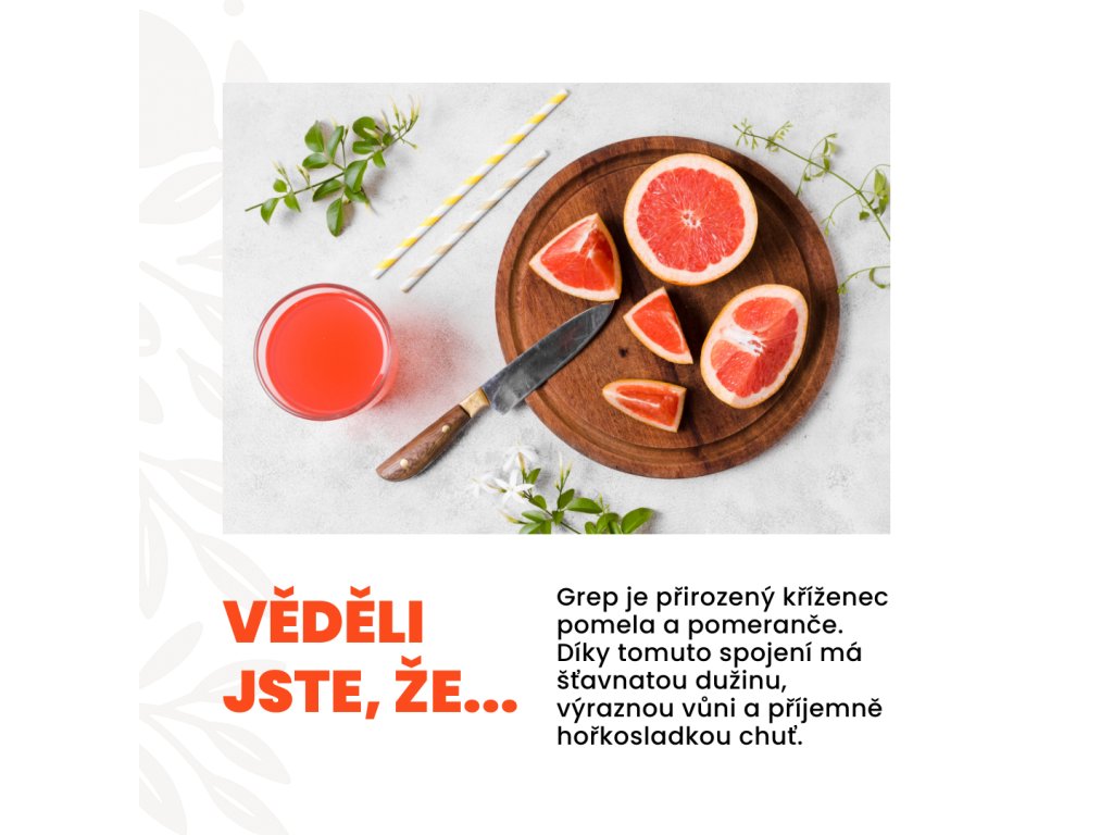 Červený grep obsahuje vysoké množství vitamínu C, B1 a K, samotný plod je napěchován blahodárně působícími přírodními flavonoidy. Grep zvyšuje obranyschopnost organismu, zlepšuje krevní oběh, snižuje hladinu cholesterolu v krvi a jeho častá konzumace snižuje riziko rakoviny plic a žaludku.