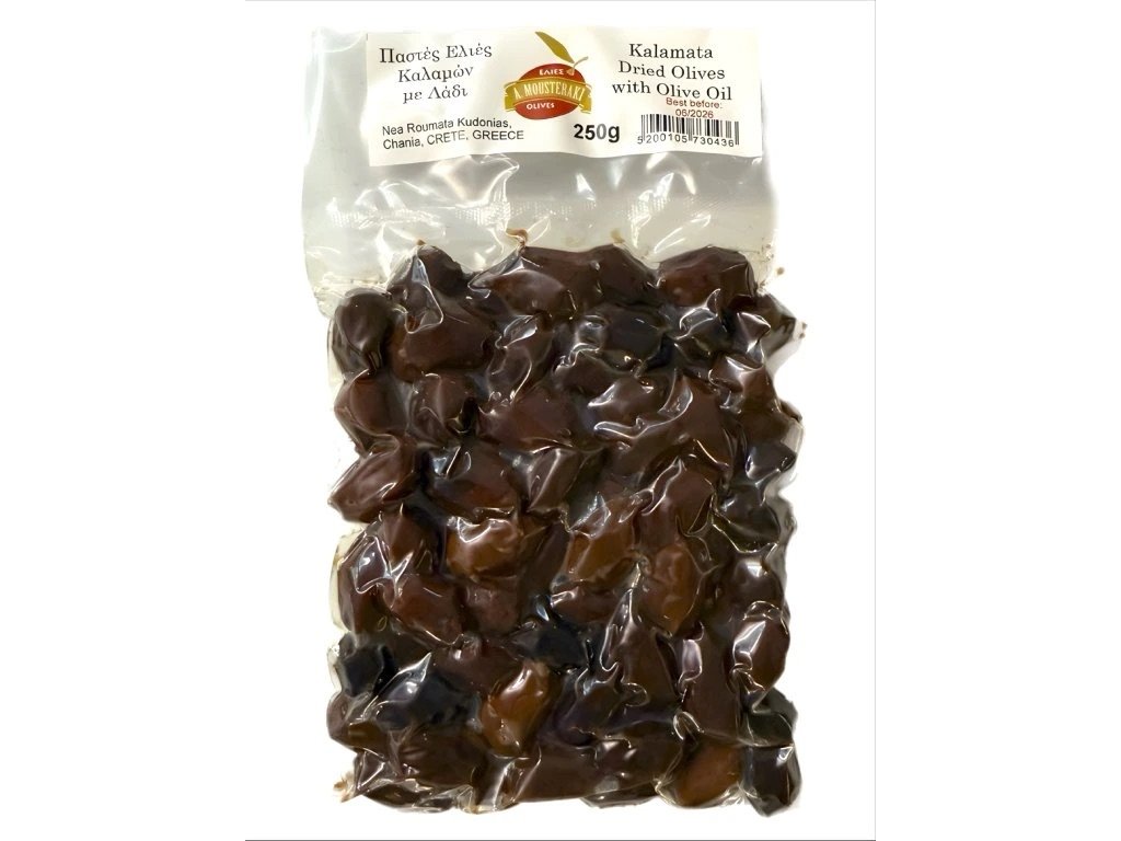 🫒 Nechybí ani polosušené olivy v olivovém oleji 250g Mousteraki, které chutnají skvěle samotné i jako příloha.
