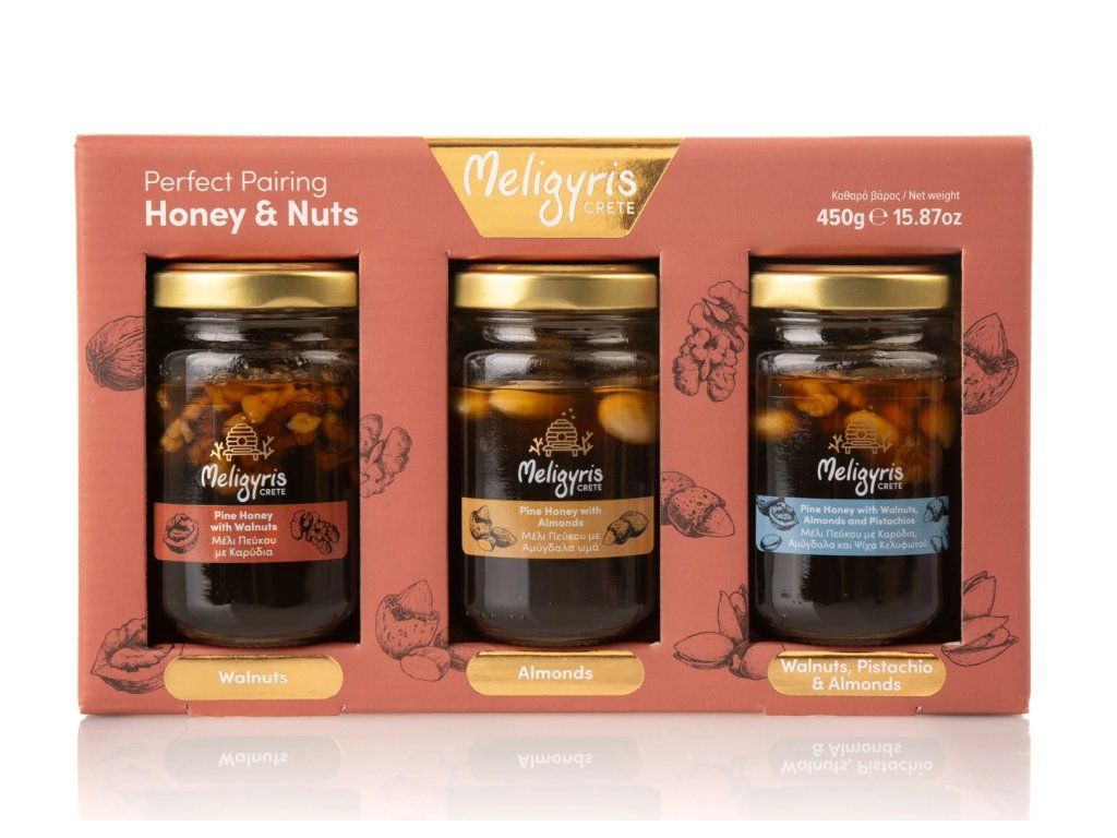 Objevte, jak chutná Řecko v té nejpoctivější podobě. Tato elegantní dárková sada Meligyris obsahuje tři skleničky borovicového medu s ořechy (3×150 g), které vznikají přímo na Krétě z medu sbíraného v borových lesích a doplněného křupavými jádry ořechů.