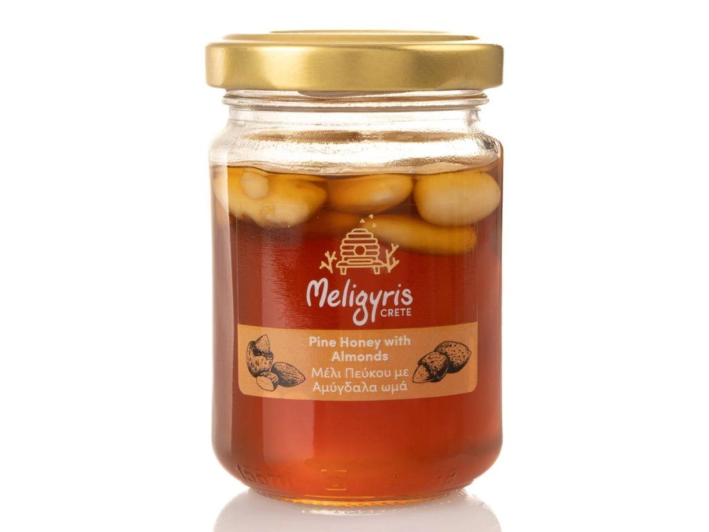 Borovicový med s mandlemi – jemně nasládlá kombinace, skvělá k jogurtu nebo na bílé pečivo.