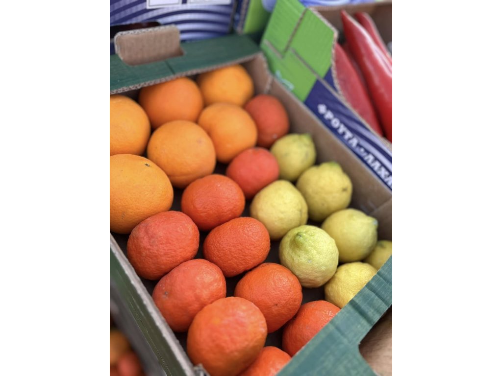 V bedýnce najdete přibližně 1,5kg pomerančů, 1,5kg mandarinek a 1kg citronů.