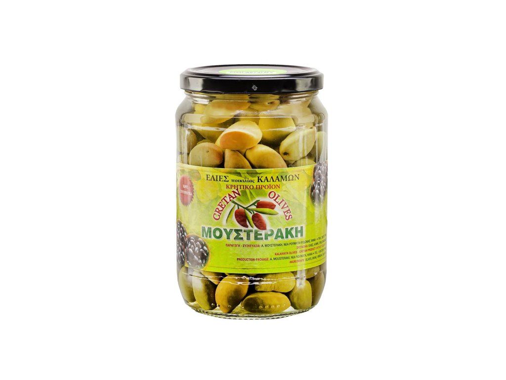 Složení: Zelené olivy odrůdy Kalamata s peckou, voda, mořská sůl, vinný ocet, olivový olej.