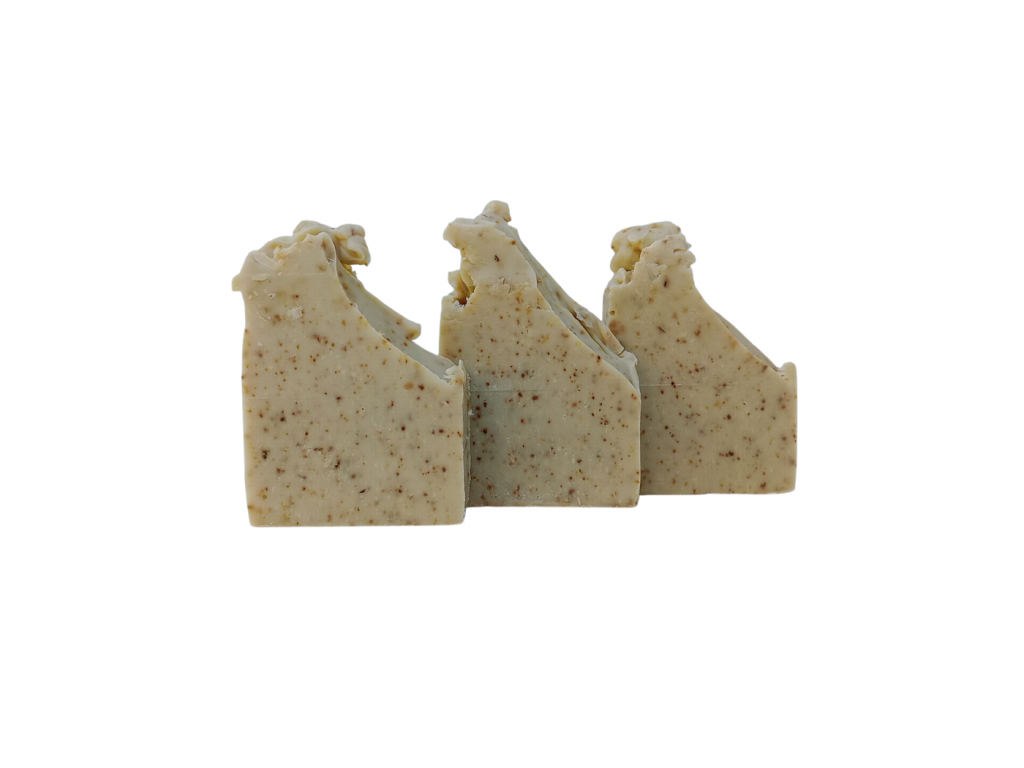 Přirozený peeling: Drcené lístky sušené šalvěje přímo v kostce mýdla zajišťují velmi jemnou a nenásilnou exfoliaci (odstranění odumřelých buněk) při každém umytí.